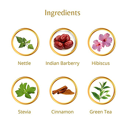 Nettle (Urtica dioica), Indian Barberry (Berberis aristata), Hibiscus (Hibiscus sabdariffa), Tulsi (Ocimum tenuiflorum), Stevia (Stevia rebaudiana), Cinnamon (Cinnamomum zeylanicum), Green Tea (Camellia sinensis)
