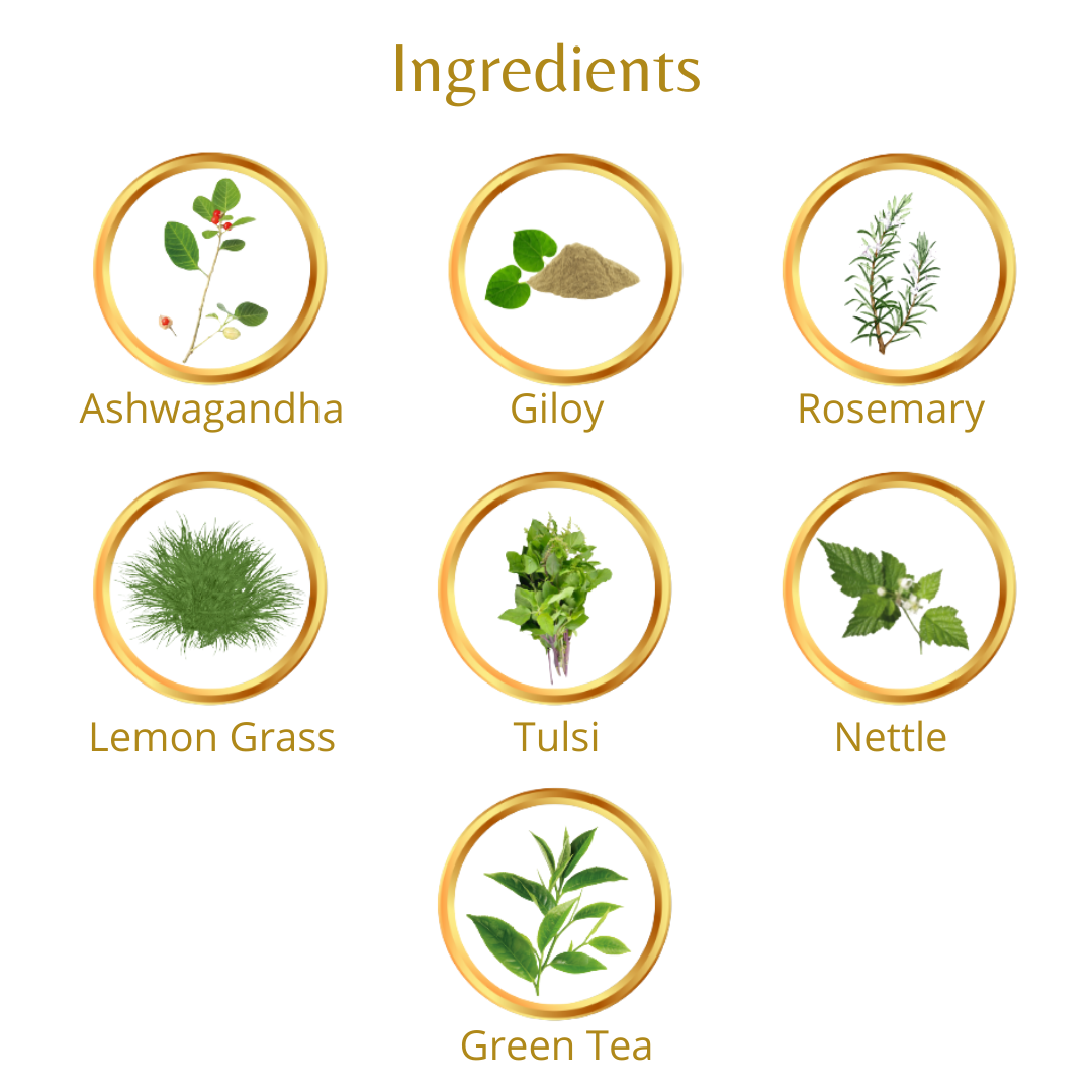 Ashwagandha (Withania somnifera), Giloy (Tinospora cordifolia), Rosemary (Rosmarinus officinalis), Lemon Grass (Cymbopogon citratus), Tulsi (Ocimum tenuiflorum), Nettle (Urtica dioica), Green Tea (Camellia sinensis).