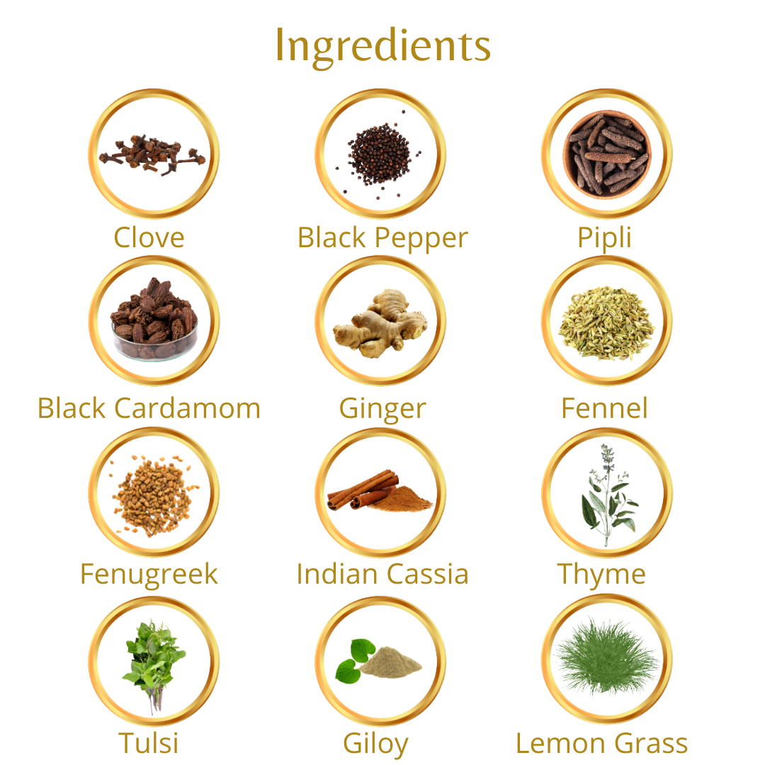 Clove (Syzygium aromaticum), Black pepper (Piper nigrum), Pipli (Piper longum), Black cardamon (Amomum subulatam), Ginger (Zingiber officinale), Fennel (Foeniculum vulgare), Fenugreek (Trigonella foenum-graecum), Cinnamon (Cinnamomum tamala), Ajwain (Trachyspermum ammi), Tulsi (Ocimum tenuiflorum), Giloy (Tinospora cordifolia), Lemon Grass (Cymbopogon citratus).